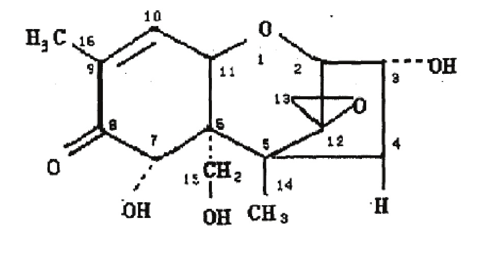 嘔吐毒素是一種單端孢霉烯族毒素,主要由粉紅鐮刀菌和禾谷鐮刀菌產(chǎn)生。其化學(xué)名為3α,7α,15-三羥基-12,13-環(huán)氧單端孢霉-9-烯-8-酮,化學(xué)式為C15H20O6,純品是一種無(wú)色針狀結(jié)晶,可在乙酸乙酯和甲醇中長(zhǎng)期保存。低劑量的嘔吐毒素,主要引起動(dòng)物食欲下降、體重減輕、代謝紊亂等癥狀,大劑量可導(dǎo)致動(dòng)物嘔吐。嘔吐毒素對(duì)消化系統(tǒng)、血液系統(tǒng)、中樞系統(tǒng)以及鈣磷代謝均產(chǎn)生影響,嘔吐毒素具有慢性和亞慢性毒性、急性毒性、免疫毒性等多種毒性作用。